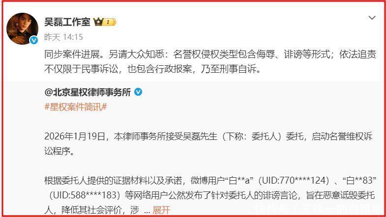 在她道歉之前,吴磊工作室转发了律师声明,表示会依法追责,并直言依法追责不仅限于民事诉讼,也包含行政报案,乃至刑事自诉。