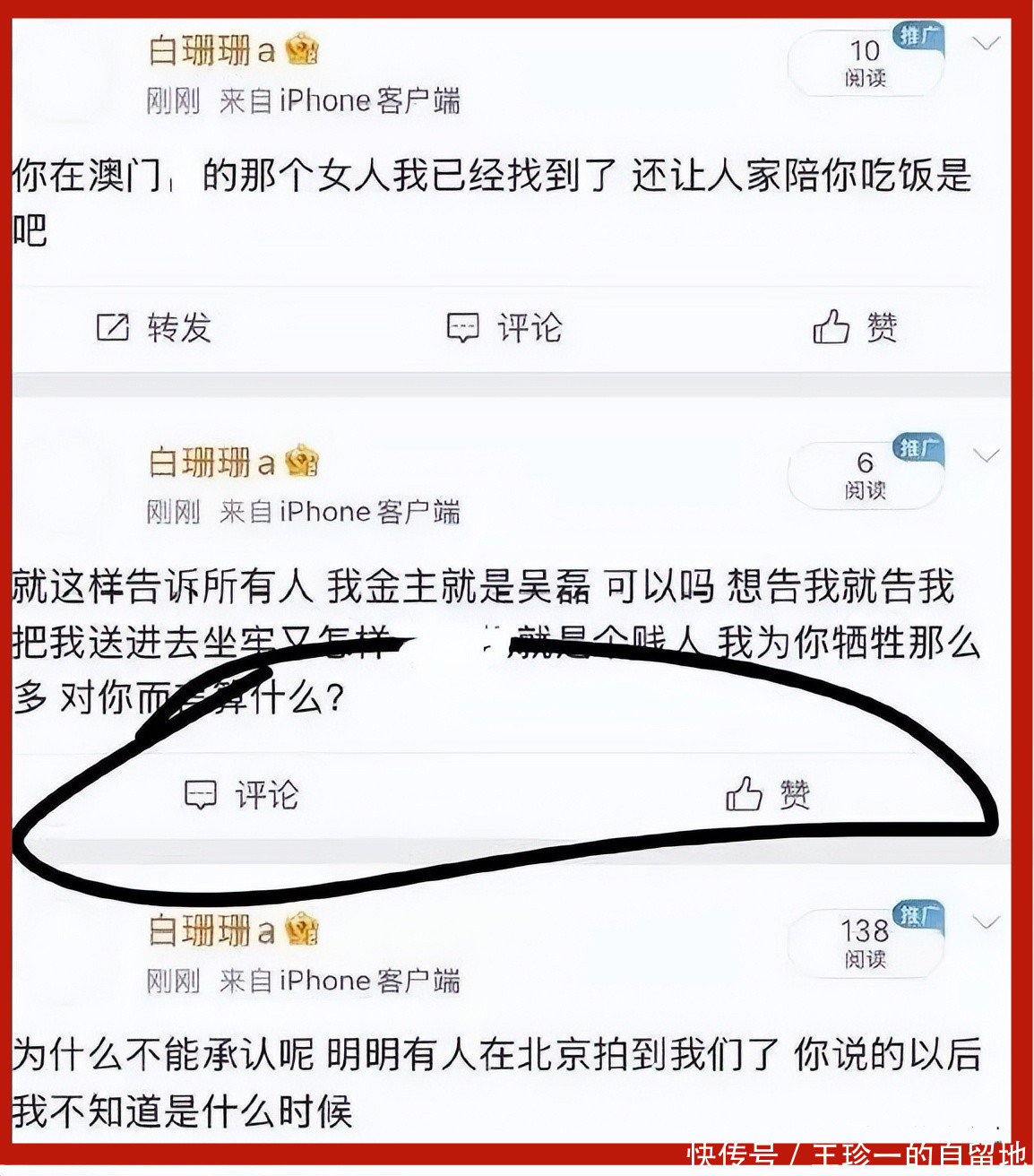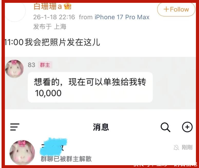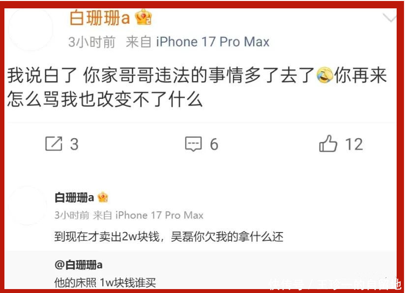 更炸裂的是白珊珊自称有吴磊的床照,她可以1万块卖给网友。
