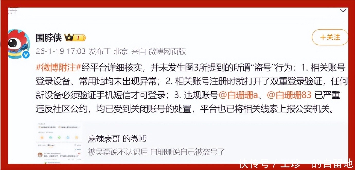 但很快她就被微博官方打脸了,平台官方直接公布了对白珊珊大号和小号的核实结果,两个账号都是正常登录,并没有被盗号。