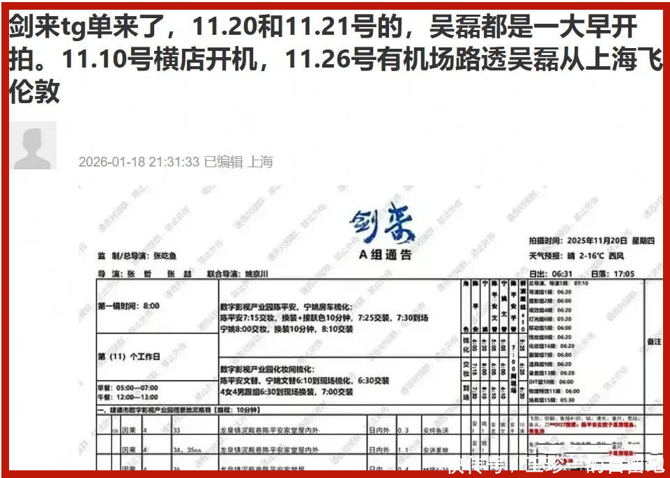 至于白珊珊内涵吴磊去年11月20日在澳门玩乐,粉丝晒出了这一天吴磊的剧组通告,这一天他在《剑来》剧组拍戏,根本没有去澳门。