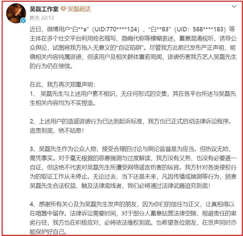 而且在转发律师声明之后,吴磊工作室再次发布了一份声明。