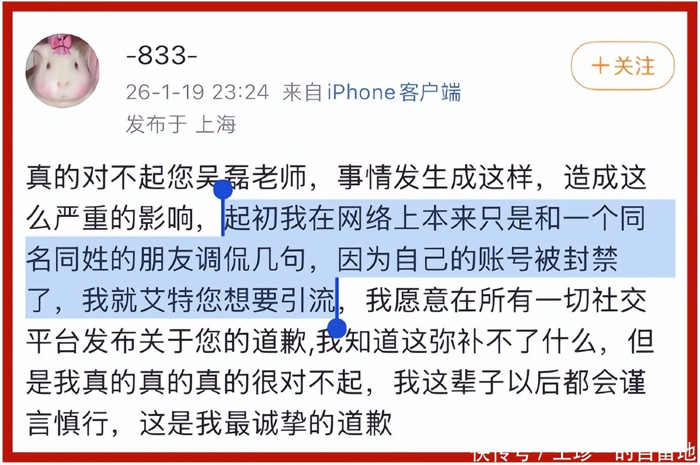 1月19日深夜,白珊珊发文道歉了。