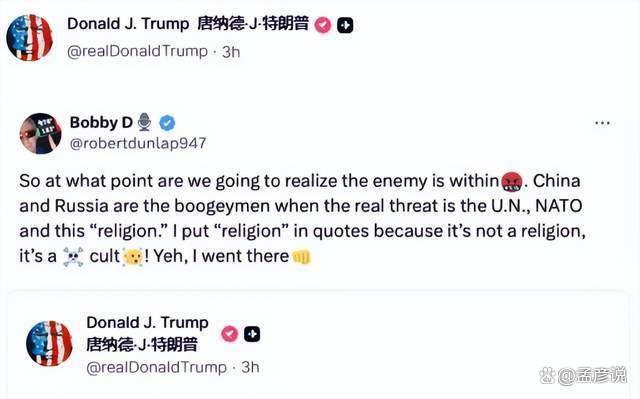 美国最大的敌人出现了,不是中俄,那是谁呢?1月20日特朗普在社交平台转发了一条帖文,上面写到:“我们何时才能认清,威胁本就藏于美国内部,中国和俄罗斯不过是唬人的稻草人,真正的威胁是联合国和北约。”