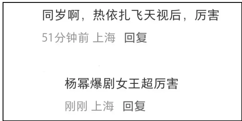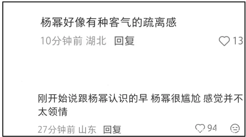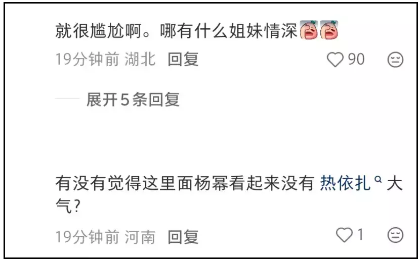 相关视频评论区,不止一位网友察觉到了二人互动别扭,有人一不小心说了大实话,指出杨幂和热依扎之间存在正面事业竞争,互相有点情绪并不意外。